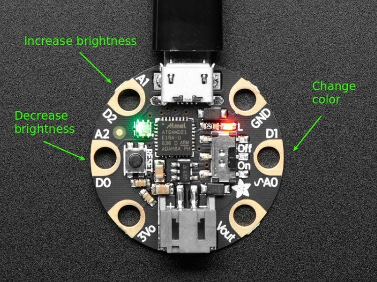 Here's the Pro version of the nightlight. Instead of being limited to the plain green color at one intensity, you can change the colors and brightness of the RGB LED using the capacitive touch pads on the Gemma M0.  Pads D0 and D2 on one side lower and raise the brightness, and D1 on the other side changes the color. You can tap the pads or hold them down. If you don't like the colors or the brightness range or steps in the program below, feel free to change them.