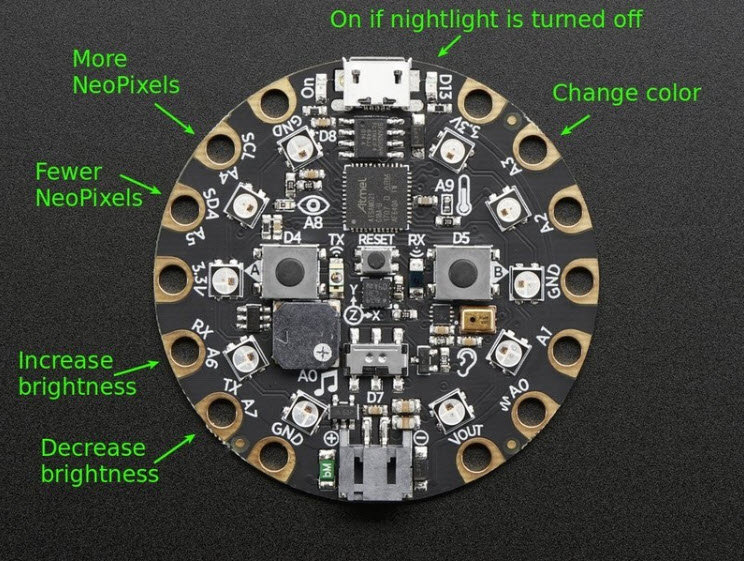 If you have a Circuit Playground Express (CPX), here's an even fancier version of the nightlight program. It starts by lighting up two NeoPixels to be green. But you can change the number of NeoPixels, change their brightness, and change color, all via the touch pads. It also provides a brightness limit (MAX_BRIGHTNESS), because the larger NeoPixels on the CPX are much brighter, and might be too bright for your nightlight.