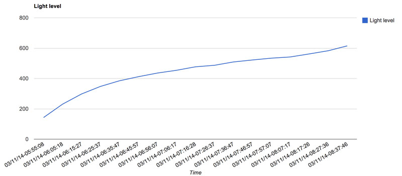 I also used the built-in plotting functions of Google Docs to plot my data as it comes in. For example, I used the simple "Line" chart type to plot the light level. This is the result over some hours in the morning, showing that the light level is slowly rising: