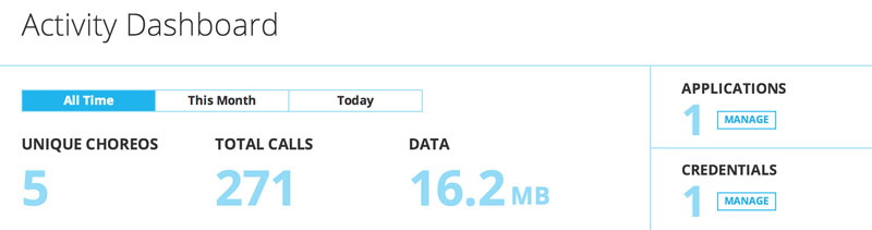 After that step, you will be asked to give a name to your first app, and you will be given an API key for your app. Please keep at hand your account name, app name, and API key, you will need them soon. In case you forgot to write these down, you can always go in "My account" and click on the "Manage" button next to "Applications" to get it back: