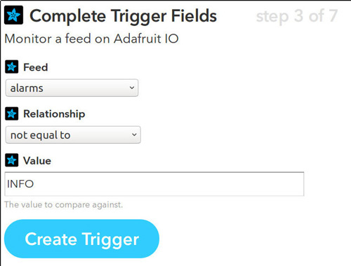 In the dropdown menus, select your alarm feed, "not equal to," and enter "INFO" in the text box. This will ensure that any text that says "ALARM" will get sent to you. When you have this dialog box configured correctly, click the "Create Trigger" button.