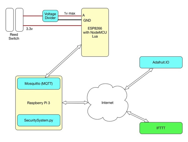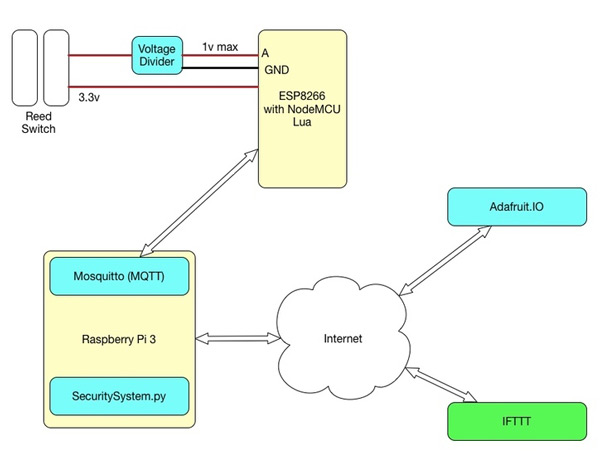 Skip the Raspberry Pi running the MQTT broker and security program. You can do this by doing more clever Lua programming than I've done and keeping track of the sensor state in the ESP8266 itself. Then it can connect directly to Adafruit.IO (I think - haven't tried this myself) to send an alarm when necessary. The IFTTT process would be exactly the same. I didn't do it this way because I'm only now teaching myself Lua and I don't think my Lua skills are up to the task yet.