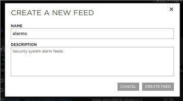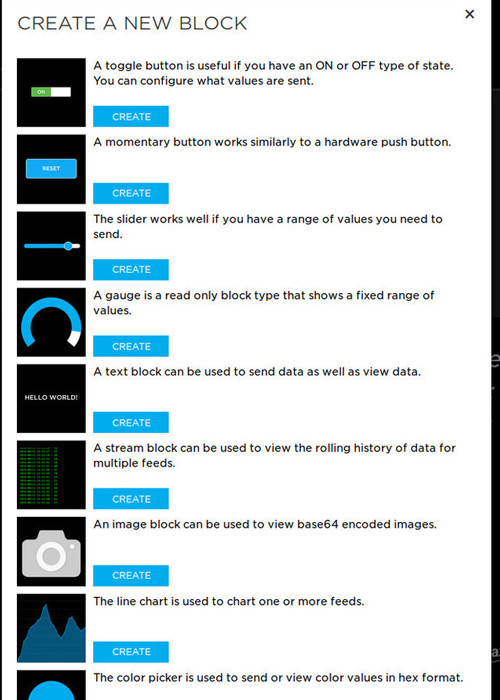 Click the "Create" button next to the text block. This will bring up another dialog box that lets you select which feeds will appear in the block. We only want one feed - the "alarms" feed you created above.