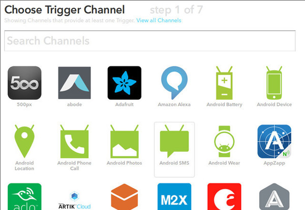 Now, I already have Adafruit as one of my trigger channels because I've already built the alarm system. You will probably need to use the search function to look for "Adafruit," or click the "view all channels" link. Find Adafruit and add it to your list of trigger channels. Then, click it to select it.