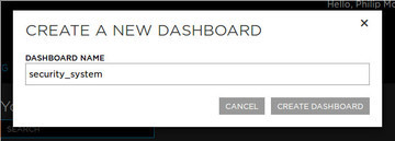 Enter the name for your new dashboard (I used "security_system") and click the "Create Dashboard" button in the lower right. You'll be shown a blank dashboard page like this: