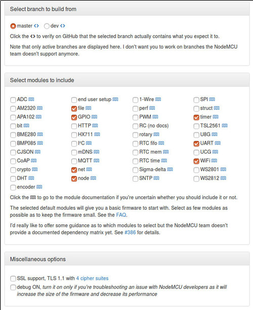 Don't despair, though! A fantastic individual named Marcel Stor has created an interactive web page that allows you to build your own custom ESP8266 firmware! Just click that link and it will take you to the firmware configuration page.