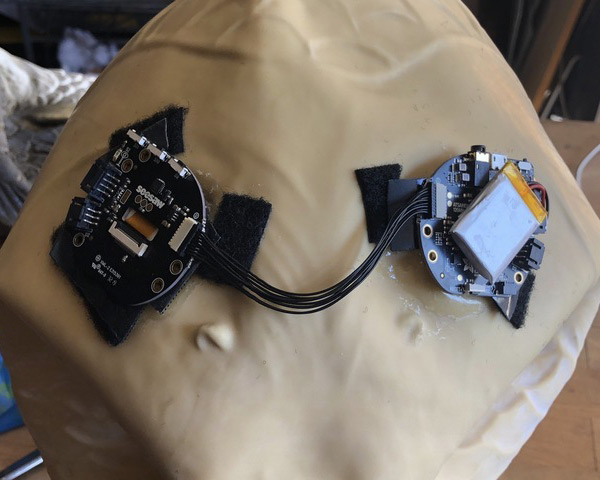 Using double-stick foam tape, secure the LiPoly battery to the back of the MONSTER M4SK's right eye board and plug it in.