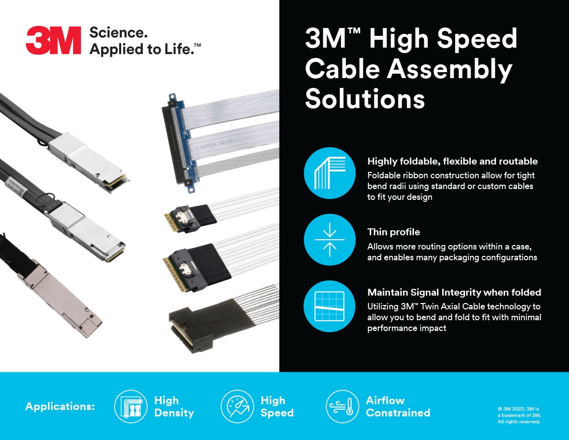 With a wide variety of options, these cable solutions add up to higher performance, less risk of downtime, improved cable and thermal management for your design. 3M™ Twin Ax High Speed Cable Solutions meet the PCIe and Ethernet standards of today and are looking ahead to the future of high-speed, high bandwidth requirements of the future.