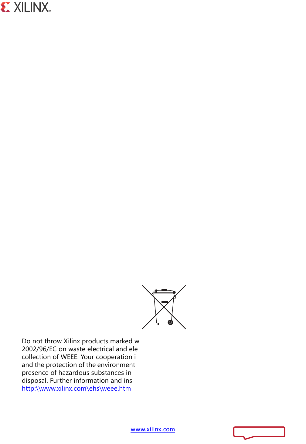 Do not throw Xilinx products marked with the “crossed out wheeled bin” in the trash. Directive