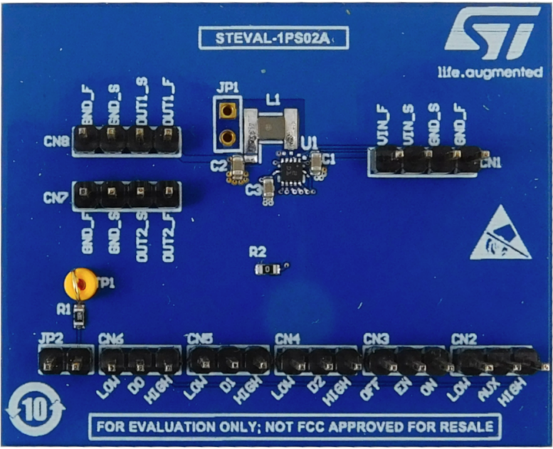 The STEVAL-1PS02A evaluation board allows evaluation of a smart converter designable to deliver up to 400 mA output current from a 1.8 V to 5.5 V input, with adynamically adjustable 1.4 V to 1.75 V output voltage.