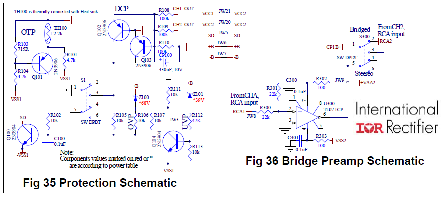 The IRAUDAMP7D uses IRS2092, a high-voltage (up to 200 V), high-speed power MOSFET driver with internal dead-time and protection functions specifically designed for Class D audio amplifier applications. These functions include OCP and UVP. The IRS2092 integrates bidirectional over current protection for both high-side and low-side MOSFETs. The dead-time can be selected for optimized performance according to the size of the MOSFET, minimizing deadtime while preventing shoot-through. As a result, there is no gate-timing adjustment required externally.